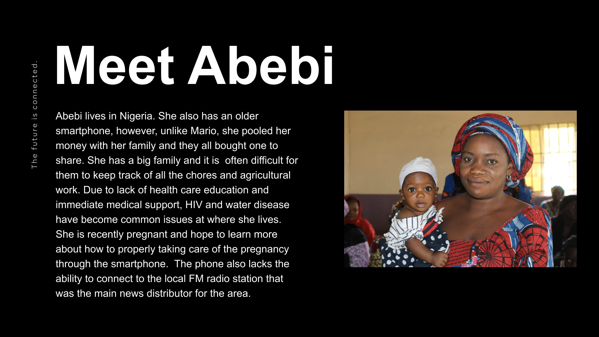 Our team did some market research on our targeted areas & users (rural area in the global south). Some main user pain points we identified are low affordability, lack of access to power and data, and travel difficulties. Based on the research findings, we created two key user personas: Mario & Abebi.